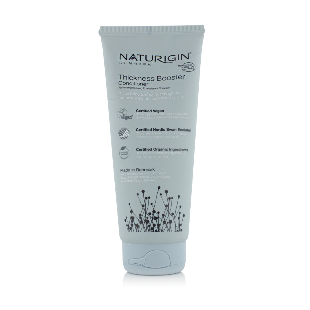 Les cosmétiques naturels danois NATURIGIN ne contiennent ni SLS, ni parabènes, ni ammoniaque. Les ingrédients naturels biologiques proviennent de sources certifiées. L'après-shampooing Thickness Booster a été certifié par le Nordic Swan Ecolabel, le logo Vegan et la certification Certified Organic Ingredients.